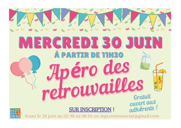La MPT vous invite à nous rejoindre pour un moment festif et amical " Apéro des retrouvailles " à partir 11h30 à la Maison Pour Tous. Sur inscription avant le 28 juin au 02 98 66 08 03 ou par email : mpt.centresocial@gmail.com
