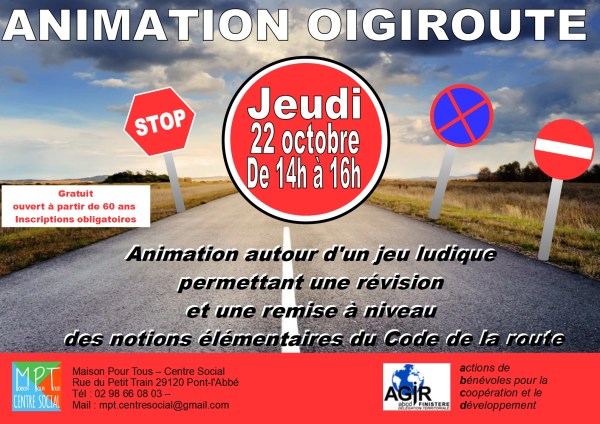ANIMATION OIGIROUTE Animation autour d'un jeu ludique permettant une révision et une remise à niveaudes notions élémentaires du Code de la route. Inscription obligatoire / Gratuit / Ouvert à partir de 60 ans