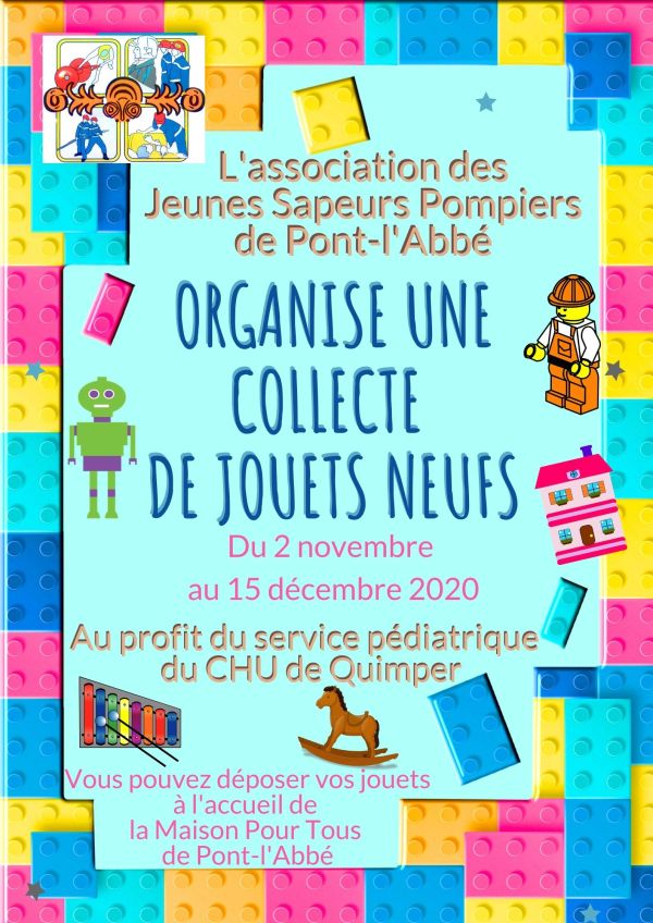 L'association des Jeunes Sapeurs Pompiers de Pont-l'Abbé Organise une collecte de jouets neufs Du 2 novembre au 15 décembre 2020 Au profit du service pédiatrique du CHU de Quimper Vous pouvez déposer vos jouets à l'accueil de la Maison Pour Tous de Pont-l'Abbé