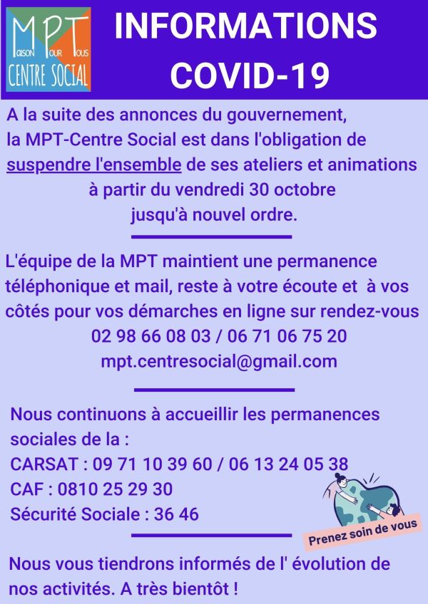 A la suite des annonces du gouvernement, la MPT-Centre Social est dans l'obligation de suspendre l'ensemble de ses ateliers et animations à partir du vendredi 30 octobre jusqu'à nouvel ordre. L'équipe de la MPT maintient une permanence téléphonique et mail, reste à votre écoute et à vos côtés pour vos démarches en ligne sur rendez-vous... Lire la Suite →