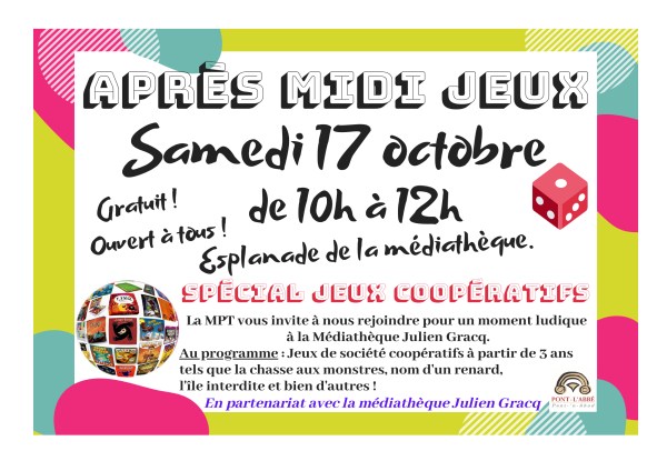 La MPT vous invite à nous rejoindre pour un moment ludique à la Médiathèque Julien Gracq. Au programme : Jeux de société coopératifs à partir de 3 ans tels que la chasse aux monstres, nom d'un renard, l'île interdite et bien d'autres ! En partenariat avec la médiathèque Julien Gracq / Gratuit et ouvert à tous !