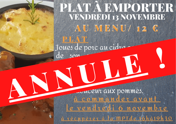 La MPT-Centre Social est dans l'obligation de suspendre l'ensemble de ses ateliers et ses animations, de ce fait annule son plat à emporter initialement prévu le 13 novembre prochain. Il sera reporté dès que possible !