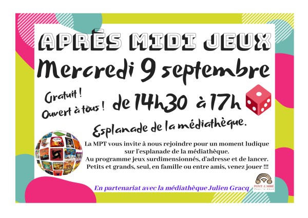 En partenariat avec la médiathèque Julien Gracq, rejoignez nous en famille ou entre amis, pour découvrir les jeux de la MPT. Venez vous divertir avec des jeux surdimensionnés, d'adresse et de lancer tel que le le passe-trappe, le molky, le mikado, le puissance 4, etc. Médiathèque - Place Benjamin Delessert à Pont-l'Abbé / de 14h30... Lire la Suite →