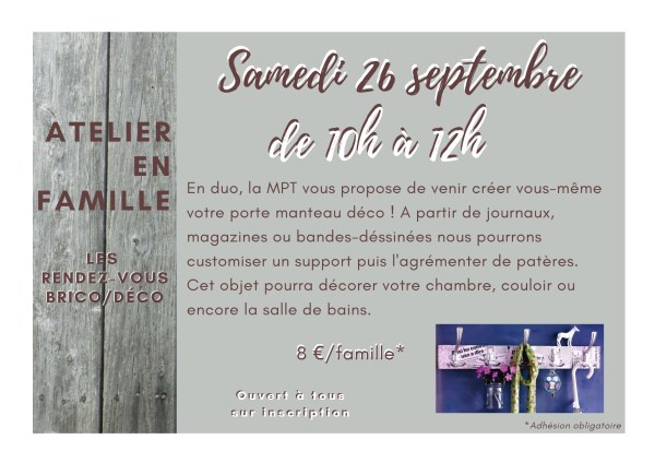 Atelier en famille " Les rendez-vous Brico/Déco " En duo, la MPT vous propose de venir créer vous-même votre porte manteau déco ! A partir de journaux, magazines ou bandes-déssinées nous pourrons customiser un support puis l'agrémenter de patères. Cet objet pourra décorer votre chambre, couloir ou encore la salle de bains. Samedi 26 septembre de... Lire la Suite →