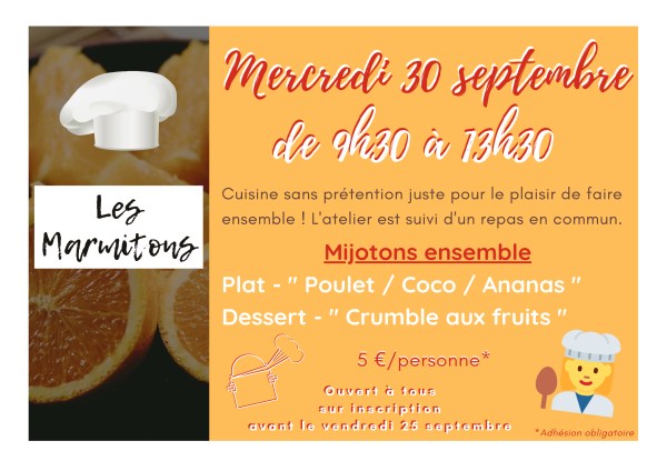 Atelier cuisine " les Marmitons " Cuisine sans prétention juste pour le plaisir de faire ensemble ! L'atelier est suivi d'un repas en commun. Mijotons ensemble : Plat - " Poulet - Coco - Ananas " / Dessert - " Crumble aux fruits " Ouvert à tous sur inscription avant le vendredi 25 septembre Mercredi 30... Lire la Suite →