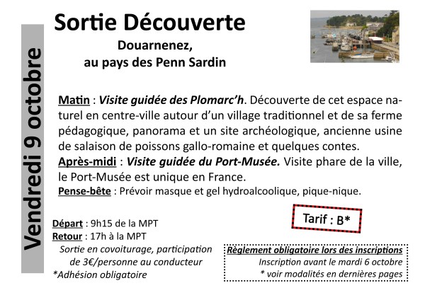 Matin : Visite guidée des Plomarc’h. Découverte de cet espace naturel en centre-ville autour d’un village traditionnel et de sa ferme pédagogique, panorama et un site archéologique, ancienne usine de salaison de poissons gallo-romaine et quelques contes.Après-midi : Visite guidée du Port-Musée. Visite phare de la ville, le Port-Musée est unique en France.Pense-bête : Prévoir masque et gel... Lire la Suite →
