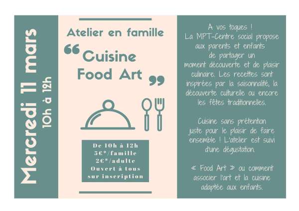 Atelier cuisine : Mercredi 11 mars de 10h à 12h Venez découvrir la cuisine " Food Art " Tarif : 5€*/famille ou 2/adulte *Adhésion obligatoire