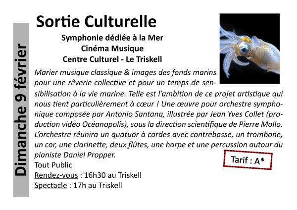 Sortie Culturelle : " Symphonie dédiée à la Mer " Cinéma Musique au LE TRISKELL - Centre Culturel " Marier musique classique & images des fonds marins… pour une rêverie collective et pour un temps de sensibilisation à la vie marine. Telle est l’ambition de ce projet artistique qui nous tient particulièrement à cœur !Une... Lire la Suite →