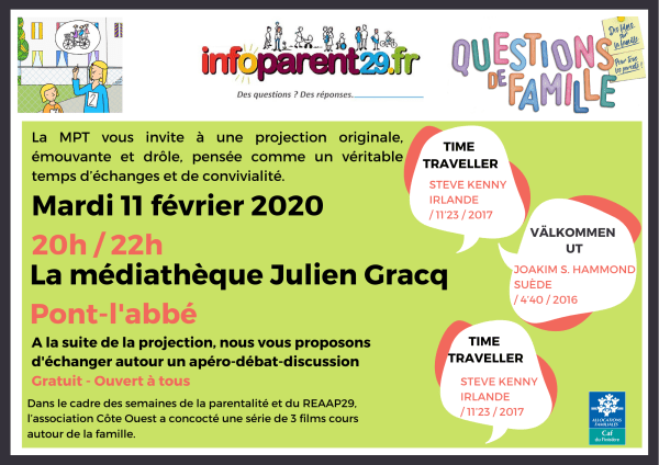 Le réseau Parentalité du Pays Bigouden vous invite à une projection originale, émouvante et drôle, pensée comme un véritable temps d’échanges et de convivialité. Mardi 11 février 2020 à la Médiathèque Julien-Gracq Ouvert à Tous - GRATUIT !!! Dans le cadre des semaines de la parentalité et du REAAP29, l’association Côte Ouest a concocté une... Lire la Suite →