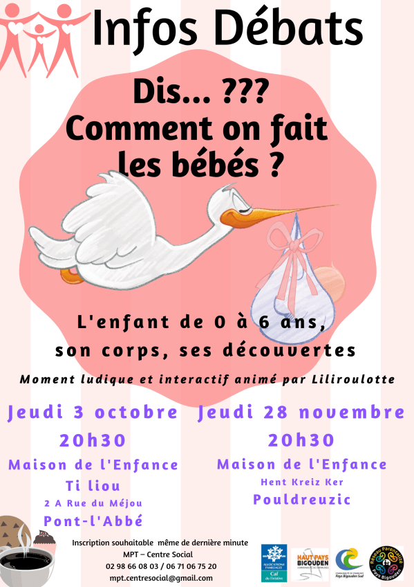 Prochaine Soirée thématique " Infos Débats " "Dis... ??? Comment on fait les bébés ? " Moment ludique et interactif animé par Liliroulotte Jeudi 3 octobre 20h30 - Maison de l'Enfance " Ti liou " - 2 A Rue du Méjou à Pont-l'Abbé. Jeudi 28 novembre 20h30 Maison de l'Enfance - Hent Kreiz Ker à... Lire la Suite →