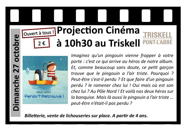 Projection Cinéma à 10h30 – Centre Culturel « Le Triskell » à Pont-L’Abbé "Perdu ? Retrouvé " de Oliver Jeffers Tarifs : 2€/personne à partir de 4 ans