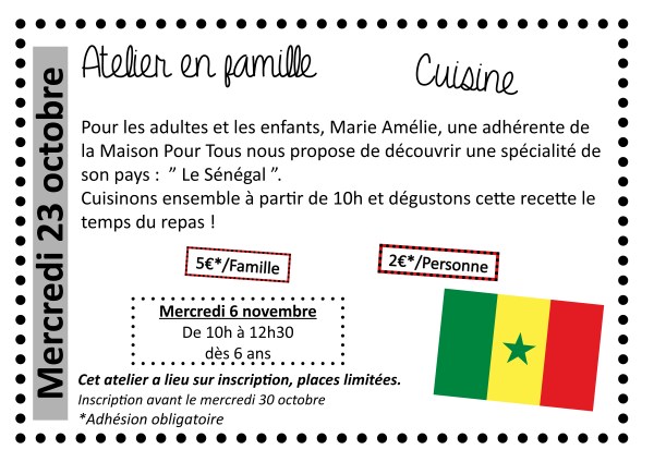 Atelier en famille – Cuisine « Sénégal » Tarifs : 5€/Famille - Adhésion et inscription Obligatoire